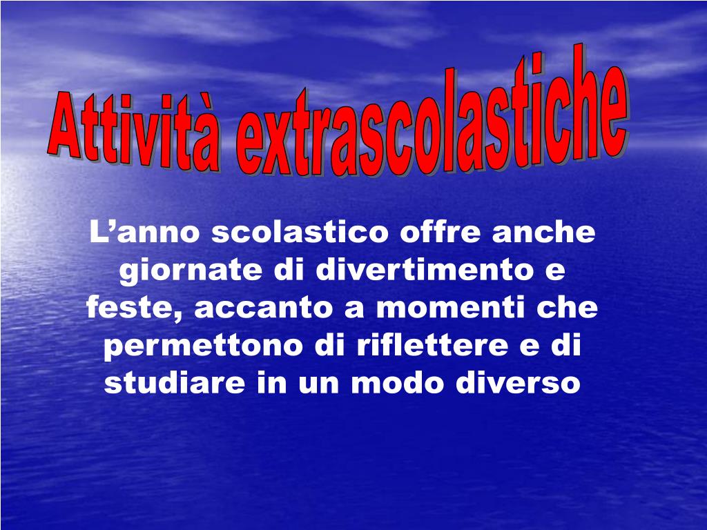 Attività extrascolastiche L’anno scolastico offre anche giornate di divertimento e feste, accanto a momenti che permettono di riflettere e di studiare in un modo diverso