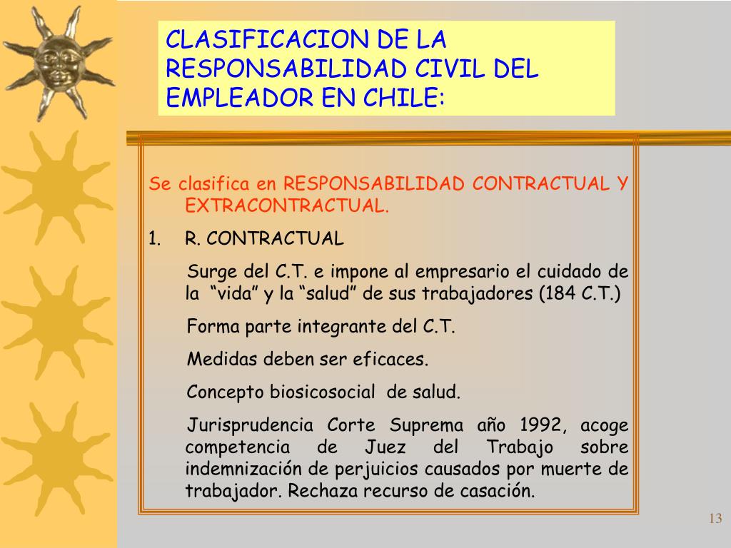 CLASIFICACION DE LA RESPONSABILIDAD CIVIL DEL EMPLEADOR EN CHILE: • Se clasifica en RESPONSABILIDAD CONTRACTUAL Y EXTRACONTRACTUAL. • R. CONTRACTUAL • Surge del C.T. e impone al empresario el cuidado de la “vida” y la “salud” de sus trabajadores (184 C.T.) • Forma parte integrante del C.T. • Medidas deben ser eficaces. • Concepto biosicosocial de salud. • Jurisprudencia Corte Suprema año 1992, acoge competencia de Juez del Trabajo sobre indemnización de perjuicios causados por muerte de trabajador. Rechaza recurso de casación.
