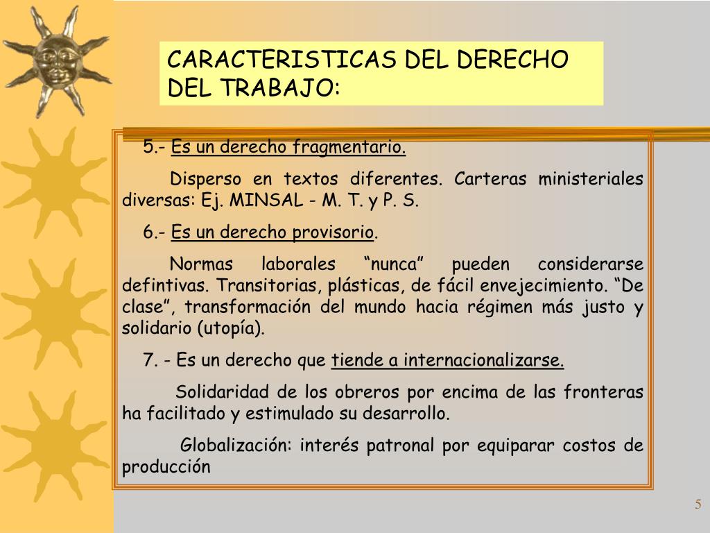 CARACTERISTICAS DEL DERECHO DEL TRABAJO: 1.- Es un derecho nuevo. Proteger la vida de las personas, dar primacía a los valores humanos sobre los materiales. 2.-Es un derecho extraetático. De generación extraparlamentaria: convenios colectivos, costumbres sindicales, laudos y sentencias normativas de los tribunales. 3.- Es un derecho concreto. Varía según diversas actividades profesionales, distintas consideraciones personales , producto de generación extraetática. 4.- Es un derecho en constante formación. Inacabado, incompleto e imperfecto: accidentes del trabajo, descanso semanal, trabajadoras temporeras (efectos teratogénicos).