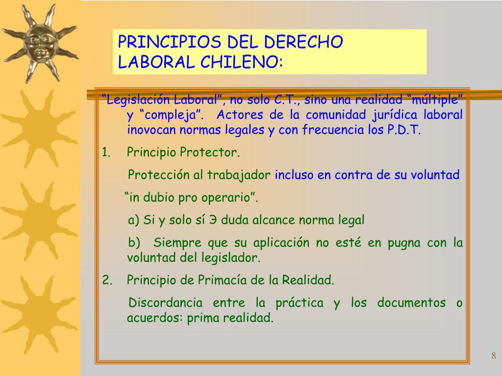 PRINCIPIOS DEL DERECHO LABORAL CHILENO: • “Legislación Laboral”, no solo C.T., sino una realidad “múltiple” y “compleja”. Actores de la comunidad jurídica laboral inovocan normas legales y con frecuencia los P.D.T. • Principio Protector. • Protección al trabajador incluso en contra de su voluntad • “in dubio pro operario”. • a) Si y solo sí Э duda alcance norma legal • b) Siempre que su aplicación no esté en pugna con la voluntad del legislador. • Principio de Primacía de la Realidad. • Discordancia entre la práctica y los documentos o acuerdos: prima realidad.