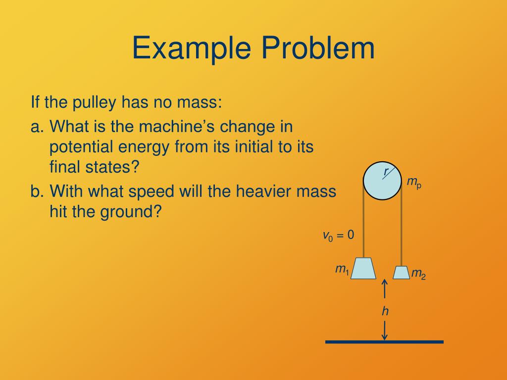Example Problem If the pulley has no mass: • What is the machine’s change in potential energy from its initial to its final states? • With what speed will the heavier mass hit the ground? r mp v0 = 0 m1 m2 h
