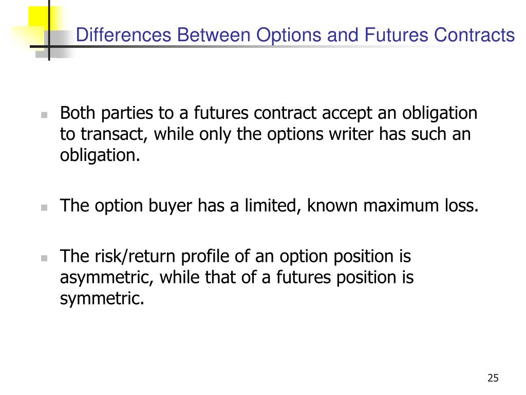 Differences Between Options and Futures Contracts • Both parties to a futures contract accept an obligation to transact, while only the options writer has such an obligation. • The option buyer has a limited, known maximum loss. • The risk/return profile of an option position is asymmetric, while that of a futures position is symmetric.