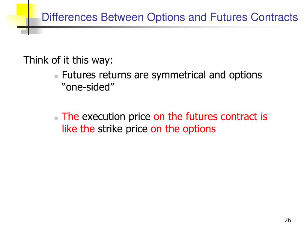 Differences Between Options and Futures Contracts Think of it this way: • Futures returns are symmetrical and options “one-sided” • The execution price on the futures contract is like the strike price on the options