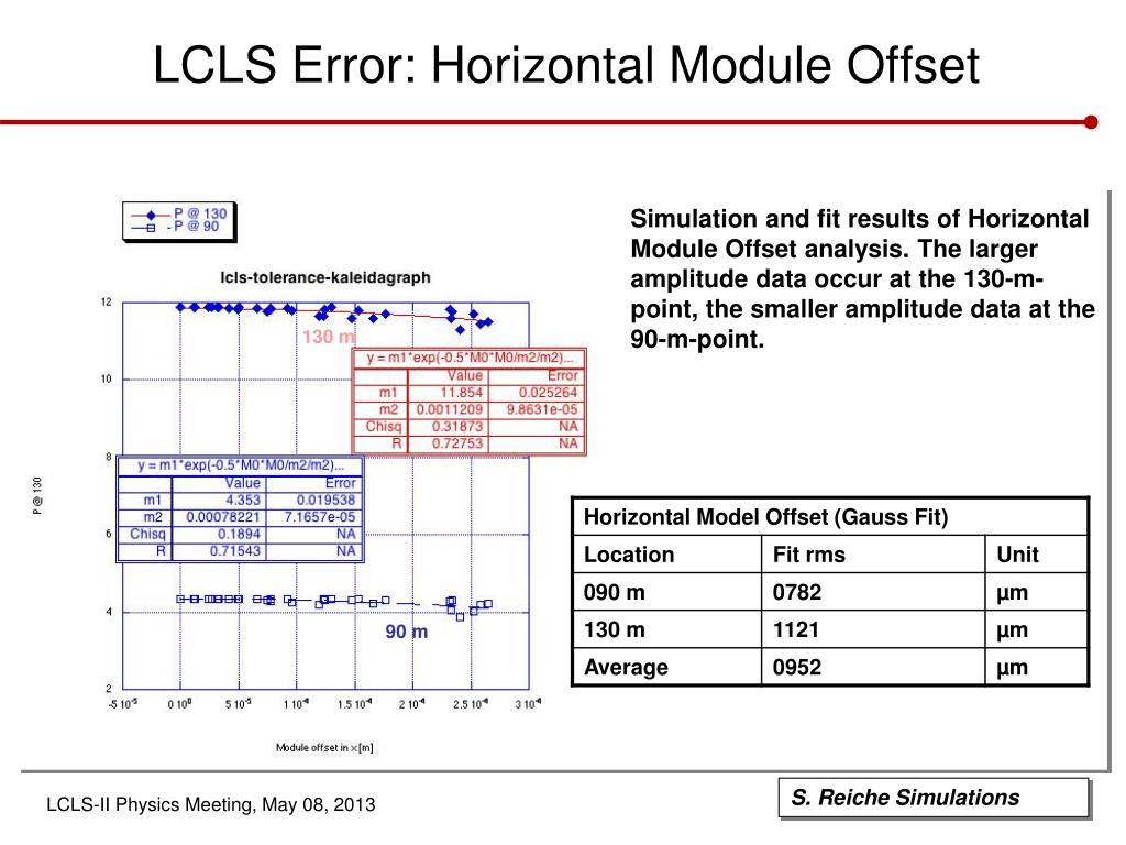 LCLS Error: Horizontal Module Offset Simulation and fit results of Horizontal Module Offset analysis. The larger amplitude data occur at the 130-m-point, the smaller amplitude data at the 90-m-point. 130 m 90 m S. Reiche Simulations Slide 7