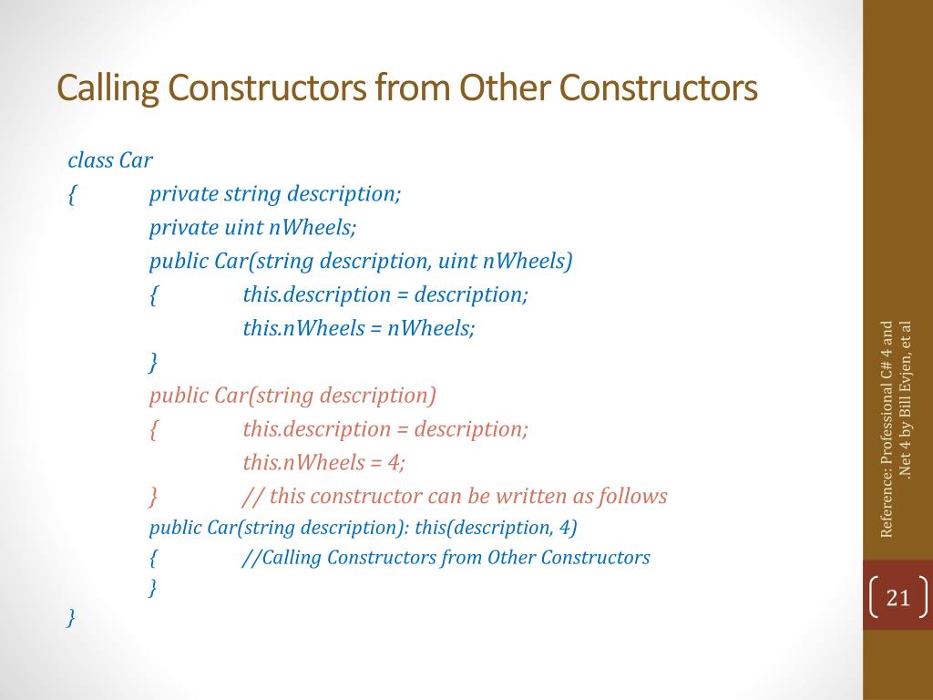 Calling Constructors from Other Constructors class Car { private string description; private uintnWheels; public Car(string description, uintnWheels) { this.description= description; this.nWheels= nWheels; } public Car(string description) { this.description= description; this.nWheels= 4; } // this constructor can be written as follows public Car(string description): this(description, 4) { //Calling Constructors from Other Constructors } } Reference: Professional C# 4 and .Net 4 by Bill Evjen, et al