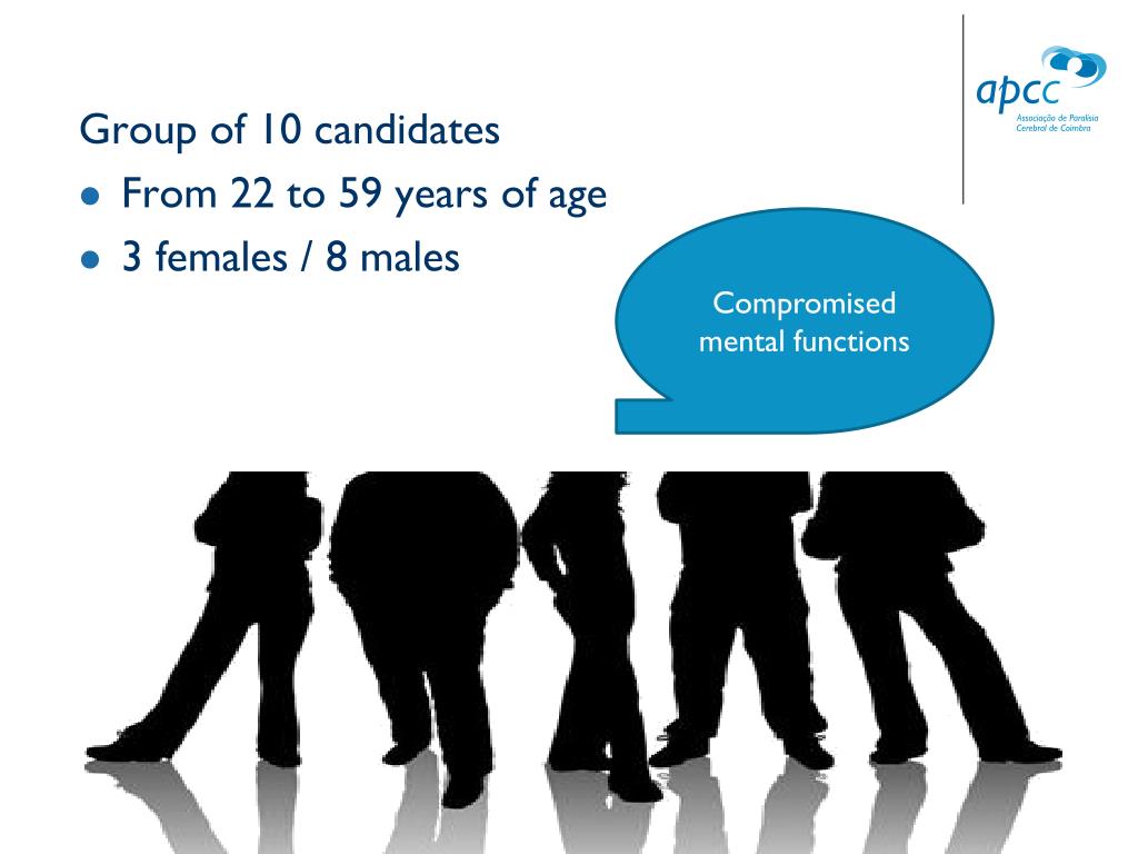 Compromised mental functions Group of 10 candidates • From 22 to 59 years of age • 3 females / 8 males