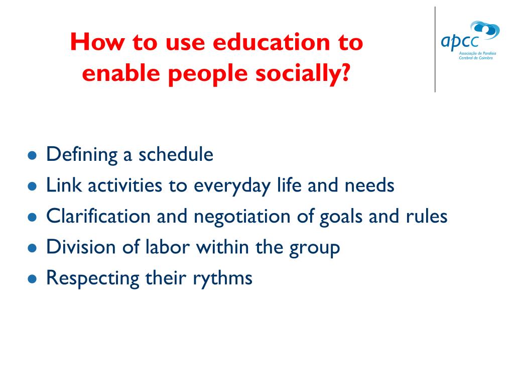 How to use education to enable people socially? • Defining a schedule • Link activities to everyday life and needs • Clarification and negotiation of goals and rules • Division of labor within the group • Respecting their rythms