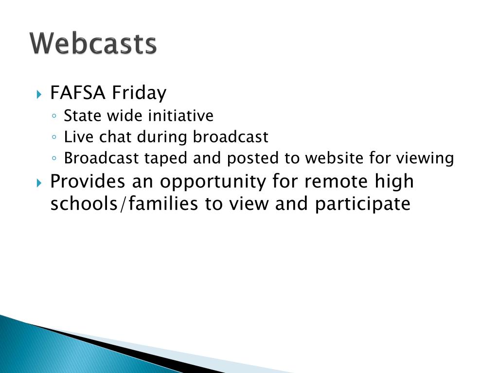 Webcasts • FAFSA Friday • State wide initiative • Live chat during broadcast • Broadcast taped and posted to website for viewing • Provides an opportunity for remote high schools/families to view and participate