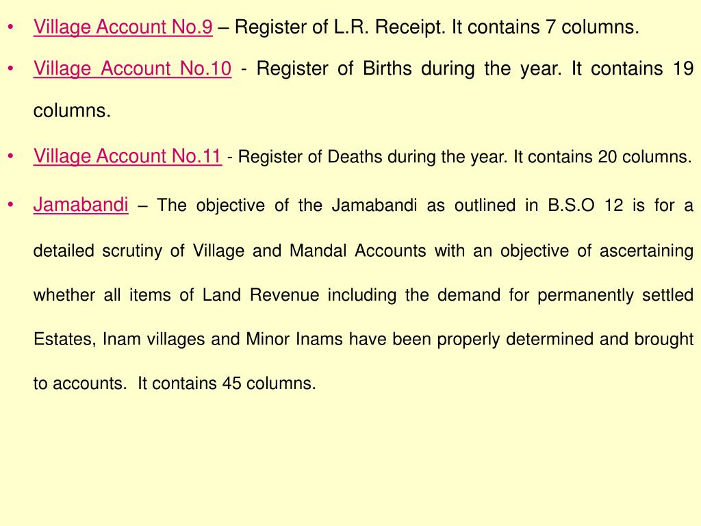 Village Account No.9 – Register of L.R. Receipt. It contains 7 columns. • Village Account No.10- Register of Births during the year. It contains 19 columns. • Village Account No.11- Register of Deaths during the year. It contains 20 columns. • Jamabandi– The objective of the Jamabandi as outlined in B.S.O 12 is for a detailed scrutiny of Village and Mandal Accounts with an objective of ascertaining whether all items of Land Revenue including the demand for permanently settled Estates, Inam villages and Minor Inams have been properly determined and brought to accounts. It contains 45 columns.