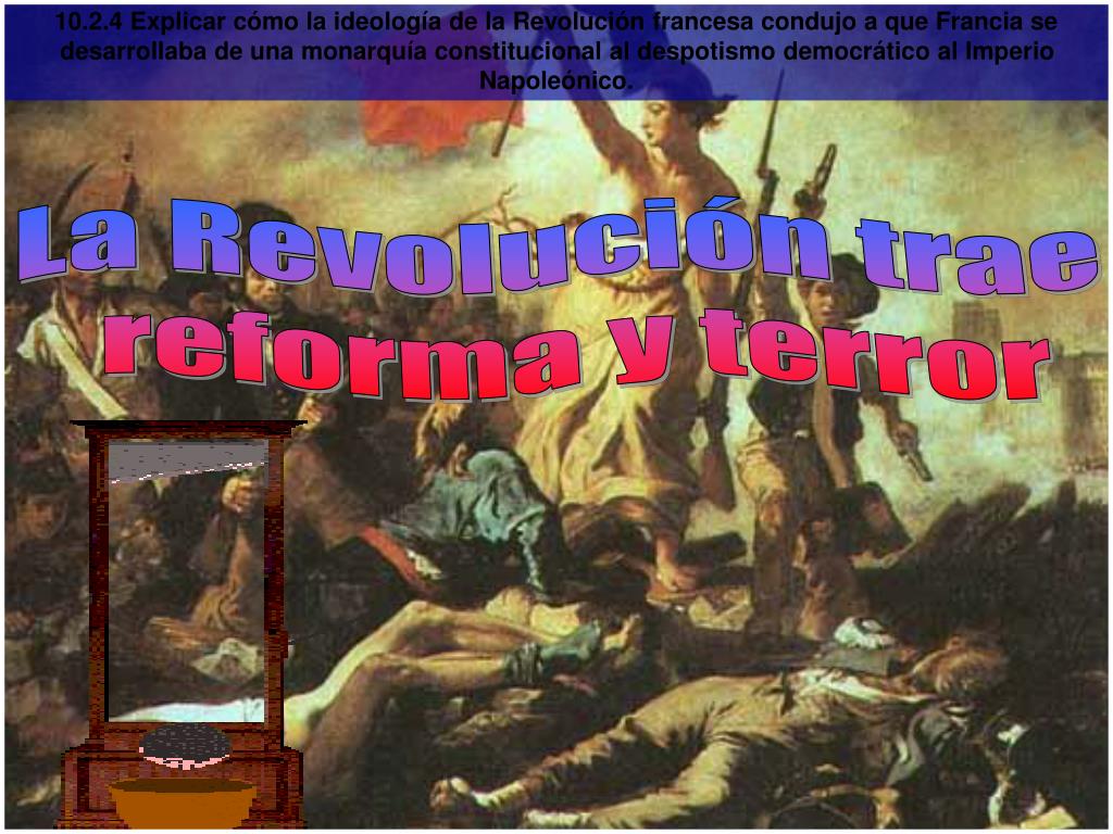 10.2.4 Explicar cómo la ideología de la Revolución francesa condujo a que Francia se desarrollaba de una monarquía constitucional al despotismo democrático al Imperio Napoleónico. La Revolución trae reforma y terror