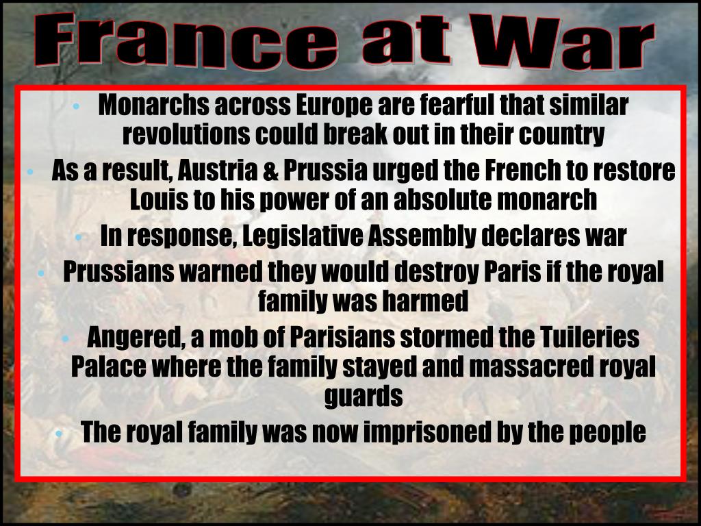 France at War • Monarchs across Europe are fearful that similar revolutions could break out in their country • As a result, Austria & Prussia urged the French to restore Louis to his power of an absolute monarch • In response, Legislative Assembly declares war • Prussians warned they would destroy Paris if the royal family was harmed • Angered, a mob of Parisians stormed the Tuileries Palace where the family stayed and massacred royal guards • The royal family was now imprisoned by the people