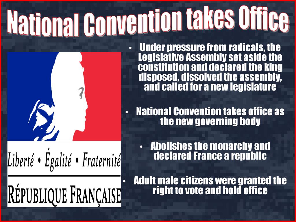 National Convention takes Office • Under pressure from radicals, the Legislative Assembly set aside the constitution and declared the king disposed, dissolved the assembly, and called for a new legislature • National Convention takes office as the new governing body • Abolishes the monarchy and declared France a republic • Adult male citizens were granted the right to vote and hold office