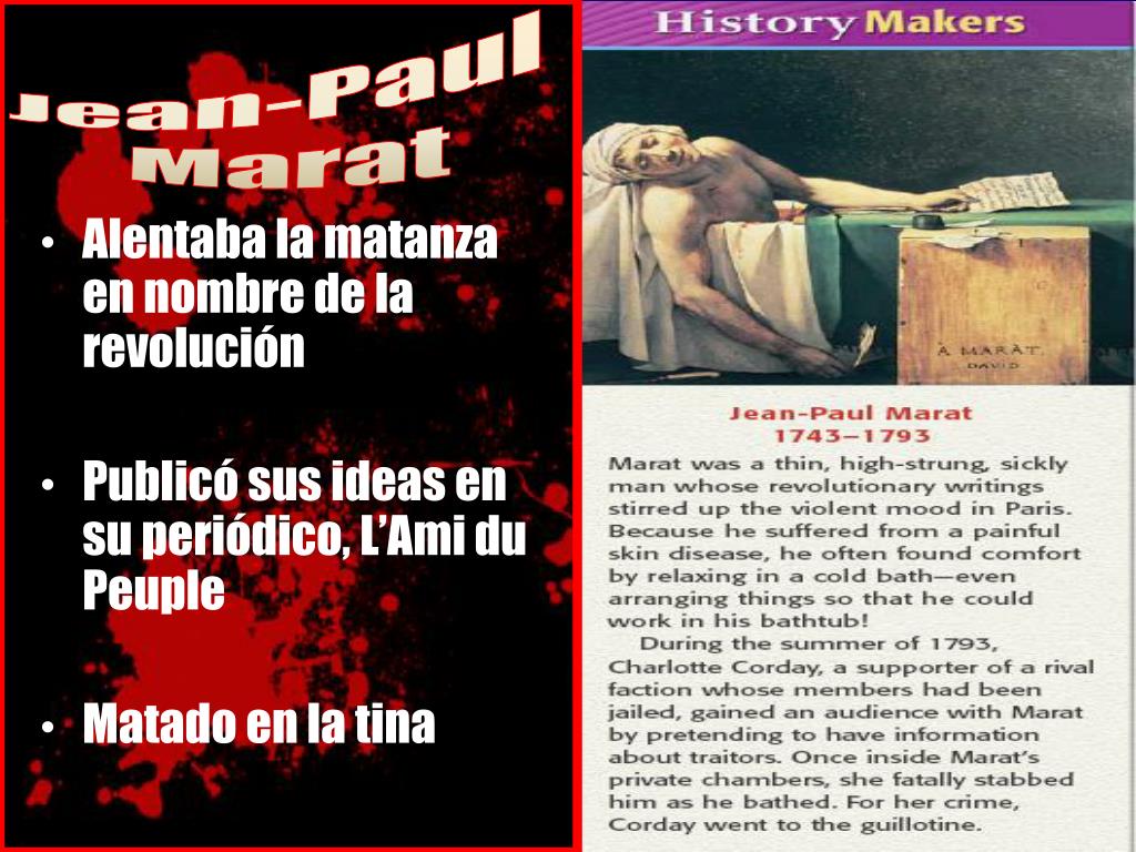 Alentaba la matanza en nombre de la revolución Publicó sus ideas en su periódico, L’Ami du Peuple Matado en la tina Jean-Paul Marat