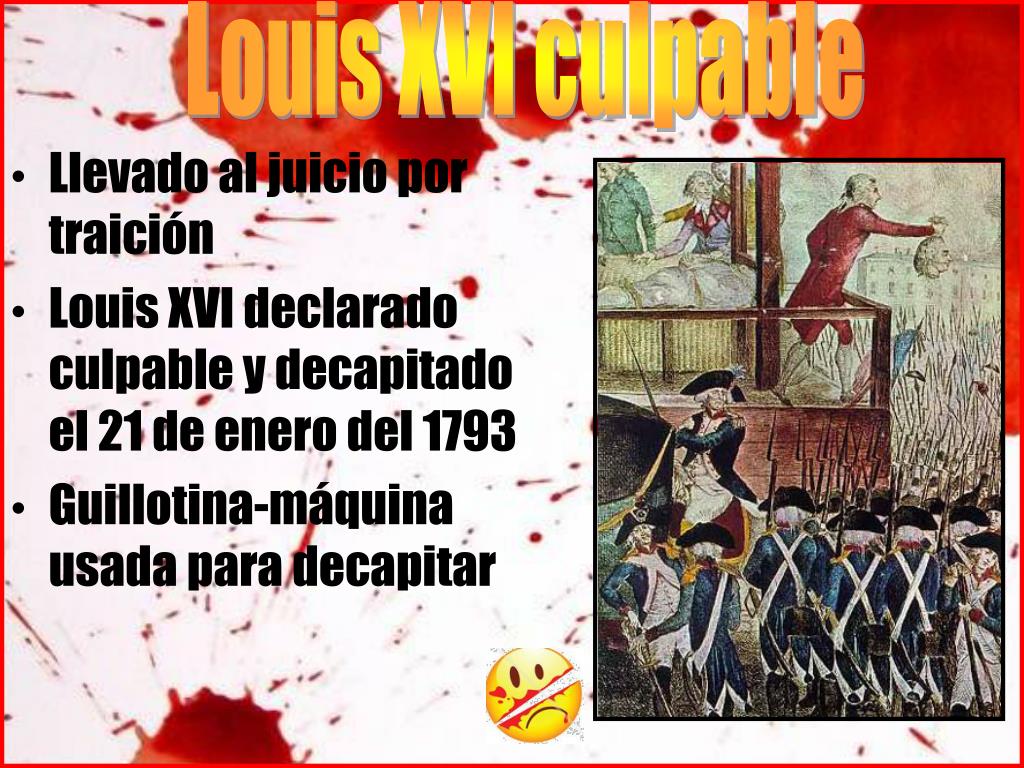 Louis XVI culpable • Llevado al juicio por traición • Louis XVI declarado culpable y decapitado el 21 de enero del 1793 • Guillotina-máquina usada para decapitar