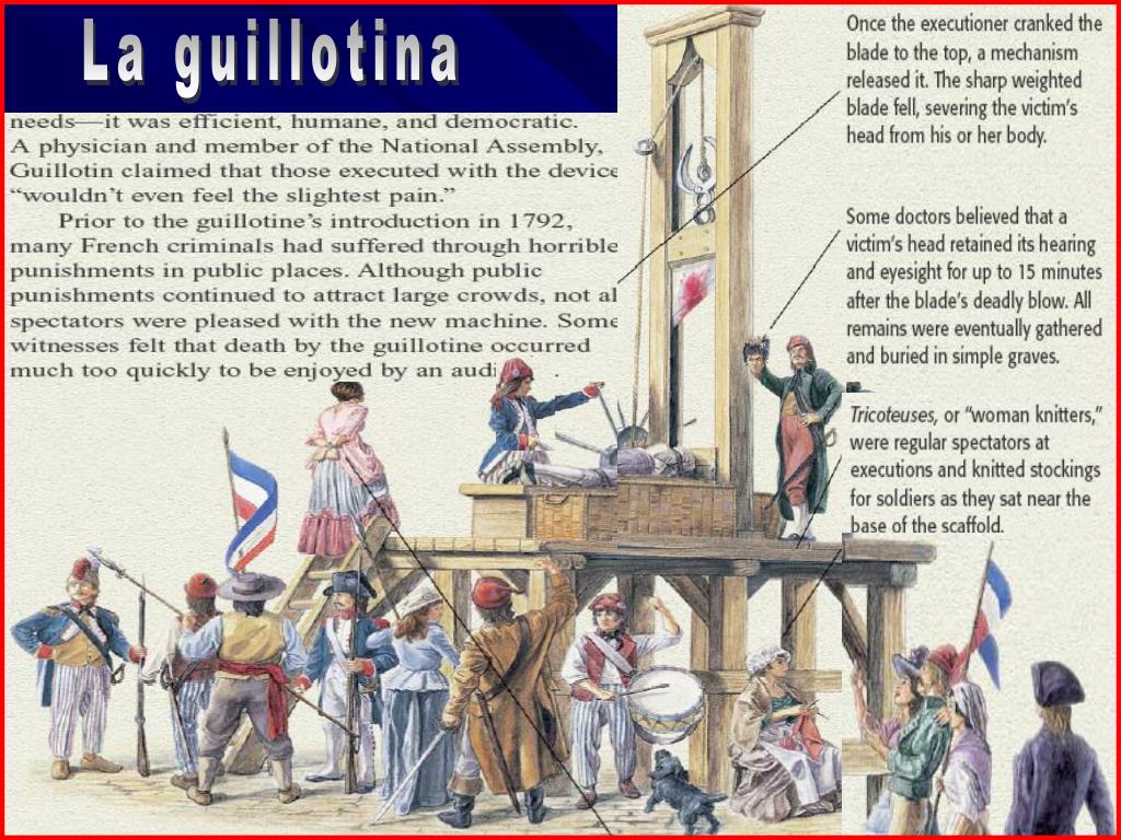 El régimen de Robespierre • Gobernó Francia como un dictador • Cambió el calendario (nuevos nombres) • No domingos y no misa porque la religión era “peligrosa” • Mandó a aquellos a la guillotina que estaban en su contra
