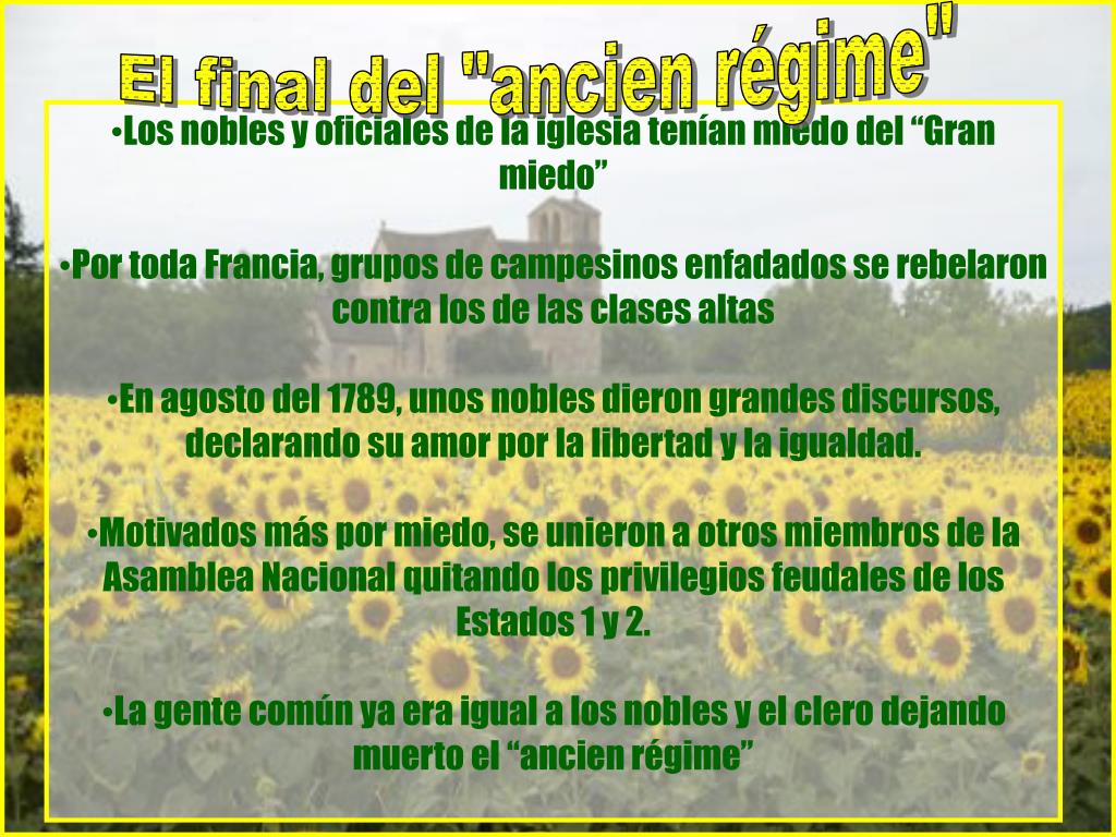 El final del "ancien régime" • Los nobles y oficiales de la iglesia tenían miedo del “Gran miedo” • Por toda Francia, grupos de campesinos enfadados se rebelaron contra los de las clases altas • En agosto del 1789, unos nobles dieron grandes discursos, declarando su amor por la libertad y la igualdad. • Motivados más por miedo, se unieron a otros miembros de la Asamblea Nacional quitando los privilegios feudales de los Estados 1 y 2. • La gente común ya era igual a los nobles y el clero dejando muerto el “ancien régime”