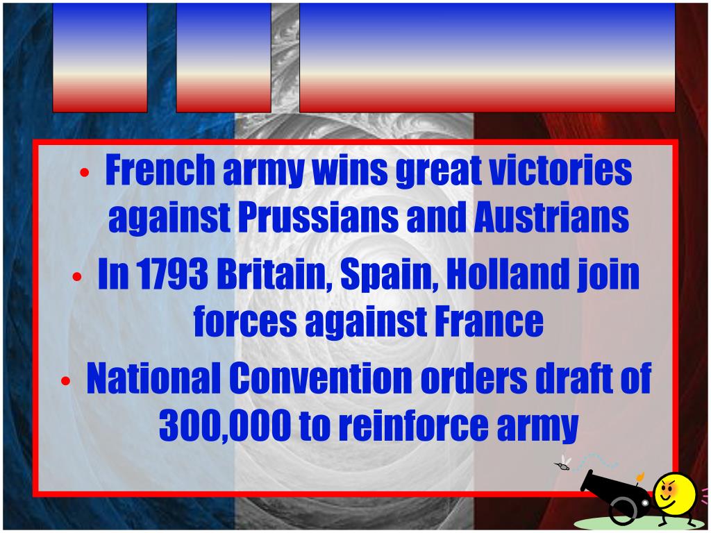 __ __ ________ • French army wins great victories against Prussians and Austrians • In 1793 Britain, Spain, Holland join forces against France • National Convention orders draft of 300,000 to reinforce army