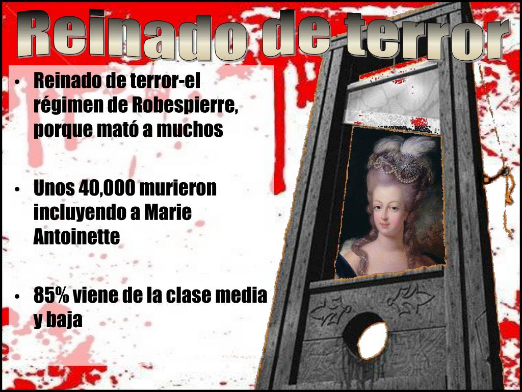 Reinado de terror • Reinado de terror-el régimen de Robespierre, porque mató a muchos • Unos 40,000 murieron incluyendo a Marie Antoinette • 85% viene de la clase media y baja