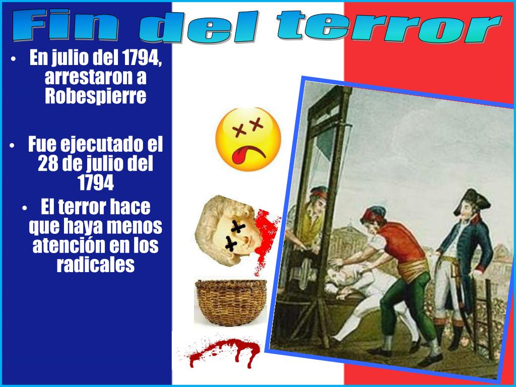 Fin del terror • En julio del 1794, arrestaron a Robespierre • Fue ejecutado el 28 de julio del 1794 • El terror hace que haya menos atención en los radicales