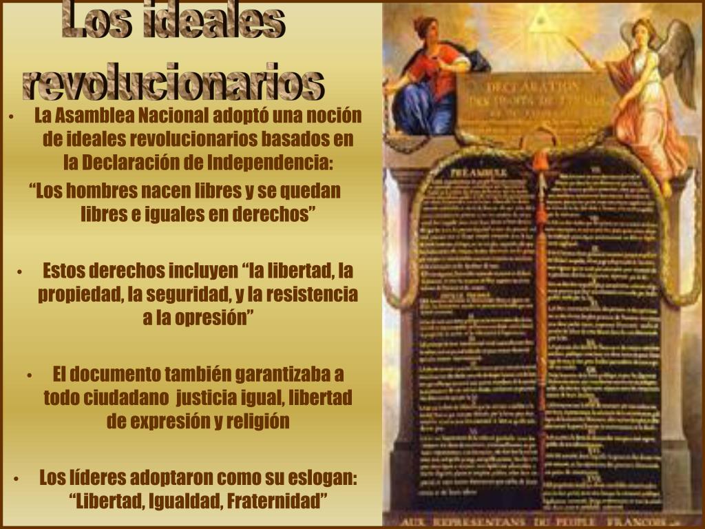 Los ideales revolucionarios • La Asamblea Nacional adoptó una noción de ideales revolucionarios basados en la Declaración de Independencia: “Los hombres nacen libres y se quedan libres e iguales en derechos” • Estos derechos incluyen “la libertad, la propiedad, la seguridad, y la resistencia a la opresión” • El documento también garantizaba a todo ciudadano justicia igual, libertad de expresión y religión • Los líderes adoptaron como su eslogan: “Libertad, Igualdad, Fraternidad”