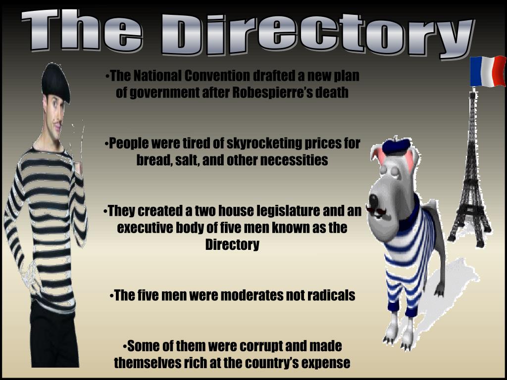 The Directory • The National Convention drafted a new plan of government after Robespierre’s death • People were tired of skyrocketing prices for bread, salt, and other necessities • They created a two house legislature and an executive body of five men known as the Directory • The five men were moderates not radicals • Some of them were corrupt and made themselves rich at the country’s expense