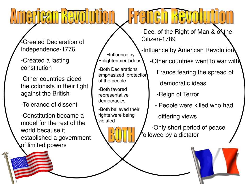 American Revolution French Revolution -Dec. of the Right of Man & of the Citizen-1789 -Influence by American Revolution -Other countries went to war with France fearing the spread of democratic ideas -Reign of Terror - People were killed who had differing views -Only short period of peace followed by a dictator -Created Declaration of Independence-1776 -Created a lasting constitution -Other countries aided the colonists in their fight against the British -Tolerance of dissent -Constitution became a model for the rest of the world because it established a government of limited powers -Influence by Enlightenment ideas -Both Declarations emphasized protection of the people -Both favored representative democracies -Both believed their rights were being violated BOTH