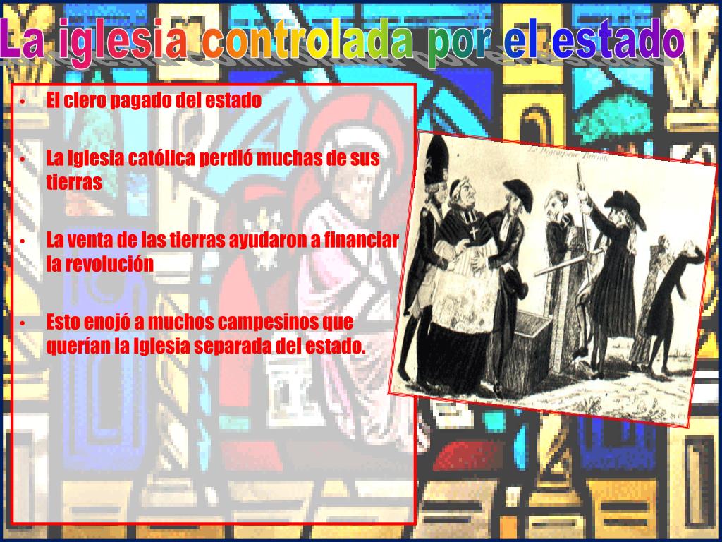 La iglesia controlada por el estado • El clero pagado del estado • La Iglesia católica perdió muchas de sus tierras • La venta de las tierras ayudaron a financiar la revolución • Esto enojó a muchos campesinos que querían la Iglesia separada del estado.
