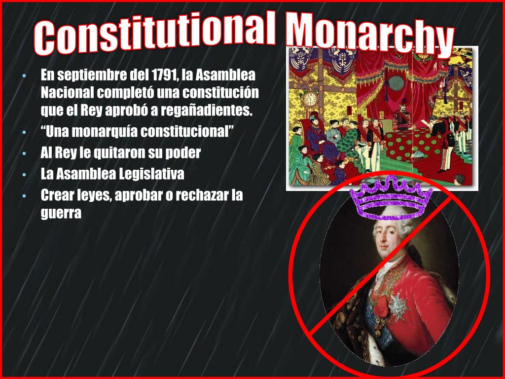 Constitutional Monarchy • En septiembre del 1791, la Asamblea Nacional completó una constitución que el Rey aprobó a regañadientes. • “Una monarquía constitucional” • Al Rey le quitaron su poder • La Asamblea Legislativa • Crear leyes, aprobar o rechazar la guerra