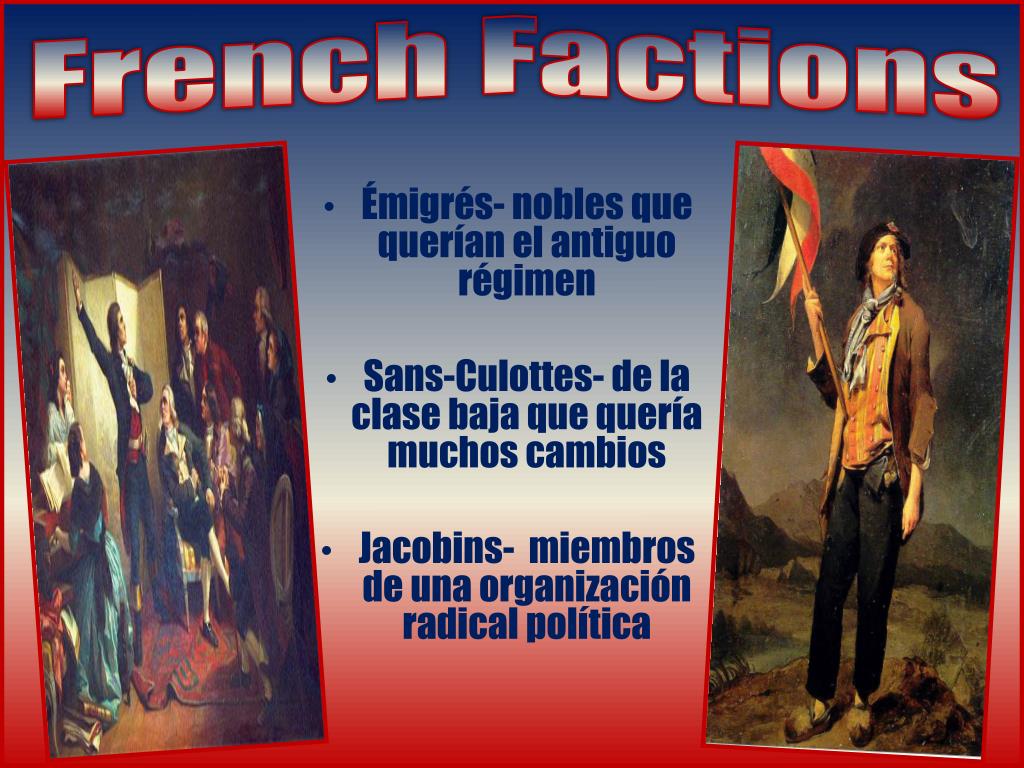 French Factions • Émigrés- nobles que querían el antiguo régimen • Sans-Culottes- de la clase baja que quería muchos cambios • Jacobins- miembros de una organización radical política