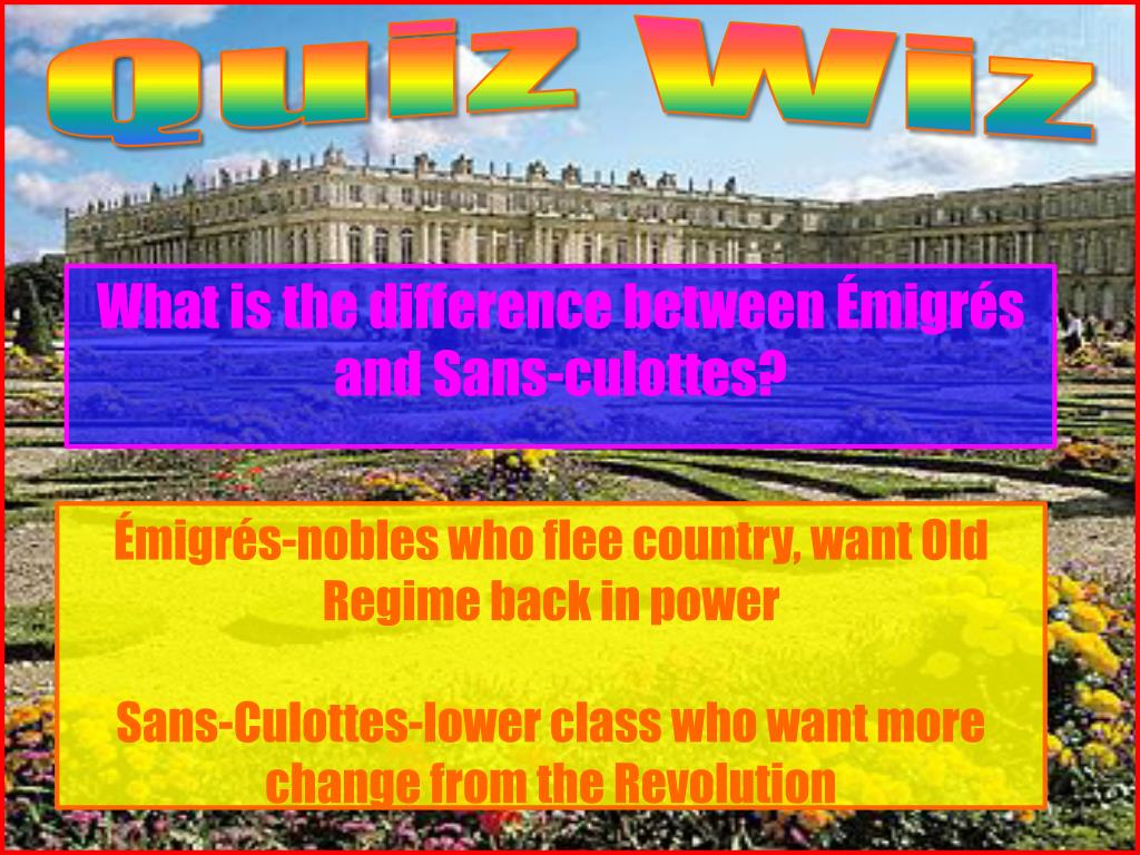 Quiz Wiz What is the difference between Émigrés and Sans-culottes? Émigrés-nobles who flee country, want Old Regime back in power Sans-Culottes-lower class who want more change from the Revolution