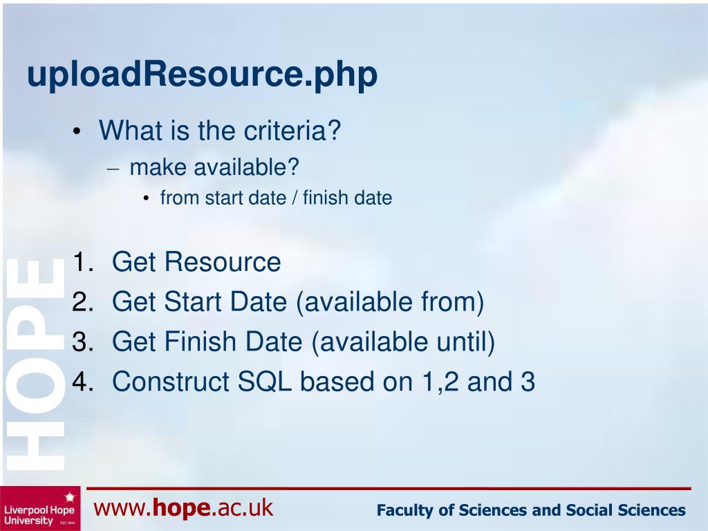 uploadResource.php • What is the criteria? • make available? • from start date / finish date • Get Resource • Get Start Date (available from) • Get Finish Date (available until) • Construct SQL based on 1,2 and 3