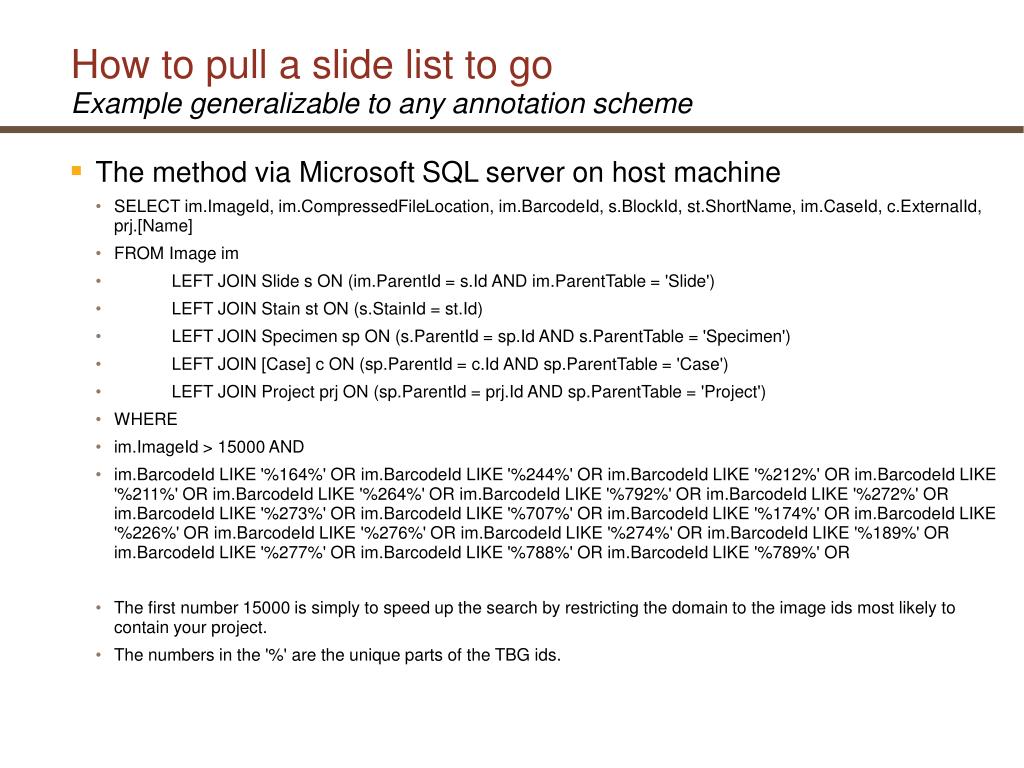 How to pull a slide list to goExample generalizable to any annotation scheme • The method via Microsoft SQL server on host machine • SELECT im.ImageId, im.CompressedFileLocation, im.BarcodeId, s.BlockId, st.ShortName, im.CaseId, c.ExternalId, prj.[Name] • FROM Image im • LEFT JOIN Slide s ON (im.ParentId = s.Id AND im.ParentTable = 'Slide') • LEFT JOIN Stain st ON (s.StainId = st.Id) • LEFT JOIN Specimen sp ON (s.ParentId = sp.Id AND s.ParentTable = 'Specimen') • LEFT JOIN [Case] c ON (sp.ParentId = c.Id AND sp.ParentTable = 'Case') • LEFT JOIN Project prj ON (sp.ParentId = prj.Id AND sp.ParentTable = 'Project') • WHERE • im.ImageId > 15000 AND • im.BarcodeId LIKE '%164%' OR im.BarcodeId LIKE '%244%' OR im.BarcodeId LIKE '%212%' OR im.BarcodeId LIKE '%211%' OR im.BarcodeId LIKE '%264%' OR im.BarcodeId LIKE '%792%' OR im.BarcodeId LIKE '%272%' OR im.BarcodeId LIKE '%273%' OR im.BarcodeId LIKE '%707%' OR im.BarcodeId LIKE '%174%' OR im.BarcodeId LIKE '%226%' OR im.BarcodeId LIKE '%276%' OR im.BarcodeId LIKE '%274%' OR im.BarcodeId LIKE '%189%' OR im.BarcodeId LIKE '%277%' OR im.BarcodeId LIKE '%788%' OR im.BarcodeId LIKE '%789%' OR • The first number 15000 is simply to speed up the search by restricting the domain to the image ids most likely to contain your project. • The numbers in the '%' are the unique parts of the TBG ids.