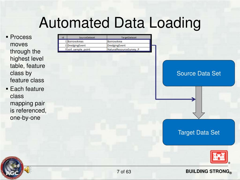 Automated Data Loading • Process moves through the highest level table, feature class by feature class • Each feature class mapping pair is referenced, one-by-one Source Data Set Target Data Set