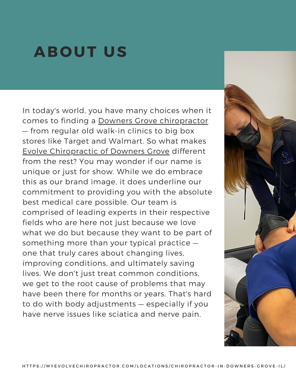 ABOUT US In today's world, you have many choices when it comes to finding a Downers Grove chiropractor — from regular old walk-in clinics to big box stores like Target and Walmart. So what makes Evolve Chiropractic of Downers Grove different from the rest? You may wonder if our name is unique or just for show. While we do embrace this as our brand image, it does underline our commitment to providing you with the absolute best medical care possible. Our team is comprised of leading experts in their respective fields who are here not just because we love what we do but because they want to be part of something more than your typical practice — one that truly cares about changing lives, improving conditions, and ultimately saving lives. We don't just treat common conditions, we get to the root cause of problems that may have been there for months or years. That's hard to do with body adjustments — especially if you have nerve issues like sciatica and nerve pain. H T T P S : / / M Y E V O L V E C H I R O P R A C T O R . C O M / L O C A T I O N S / C H I R O P R A C T O R - I N - D O W N E R S - G R O V E - I L /