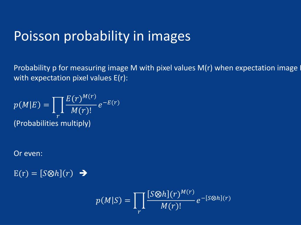 Poisson probability in images Probability p formeasuringimage M withpixelvalues M(r) whenexpectationimage E withexpectationpixelvalues E(r): (Probabilities multiply) Or even: