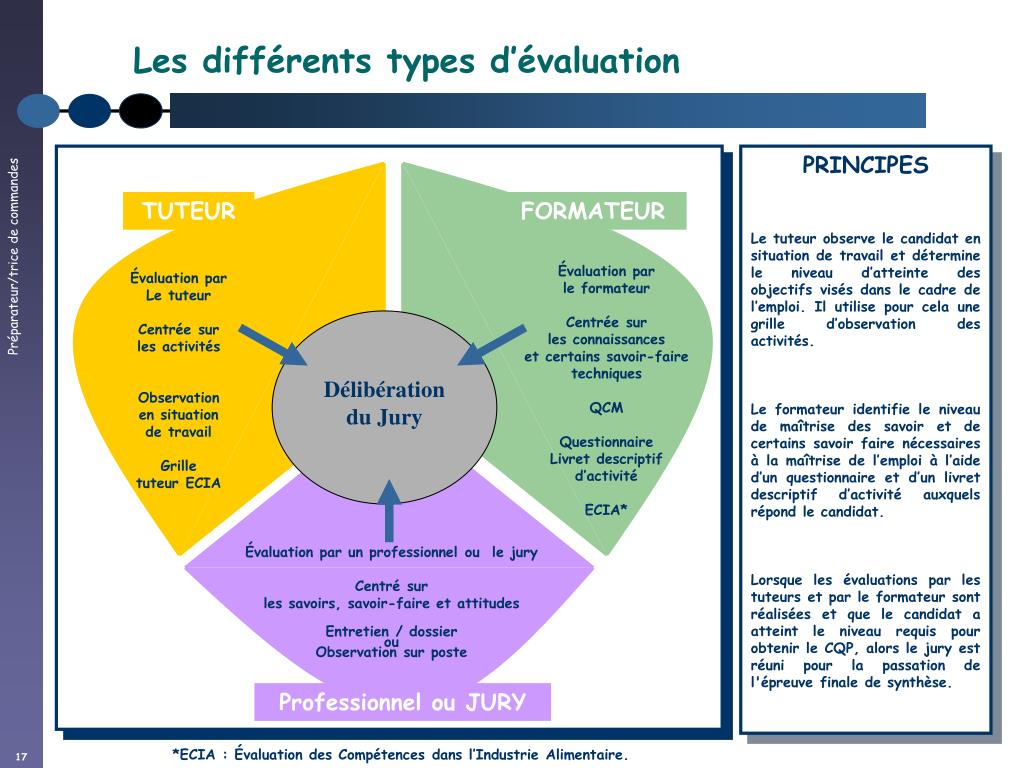 Les différents types d’évaluation PRINCIPES Le tuteur observe le candidat en situation de travail et détermine le niveau d’atteinte des objectifs visés dans le cadre de l’emploi. Il utilise pour cela une grille d’observation des activités. Le formateur identifie le niveau de maîtrise des savoir et de certains savoir faire nécessaires à la maîtrise de l’emploi à l’aide d’un questionnaire et d’un livret descriptif d’activité auxquels répond le candidat. Lorsque les évaluations par les tuteurs et par le formateur sont réalisées et que le candidat a atteint le niveau requis pour obtenir le CQP, alors le jury est réuni pour la passation de l'épreuve finale de synthèse. TUTEUR FORMATEUR Évaluation par le formateur Centrée sur les connaissances et certains savoir-faire techniques QCM Questionnaire Livret descriptif d’activité ECIA* Évaluation par Le tuteur Centrée sur les activités Observation en situation de travail Grille tuteur ECIA Délibération du Jury Évaluation par un professionnel ou le jury Centré sur les savoirs, savoir-faire et attitudes Entretien / dossier ouObservation sur poste Professionnel ou JURY *ECIA : Évaluation des Compétences dans l’Industrie Alimentaire.