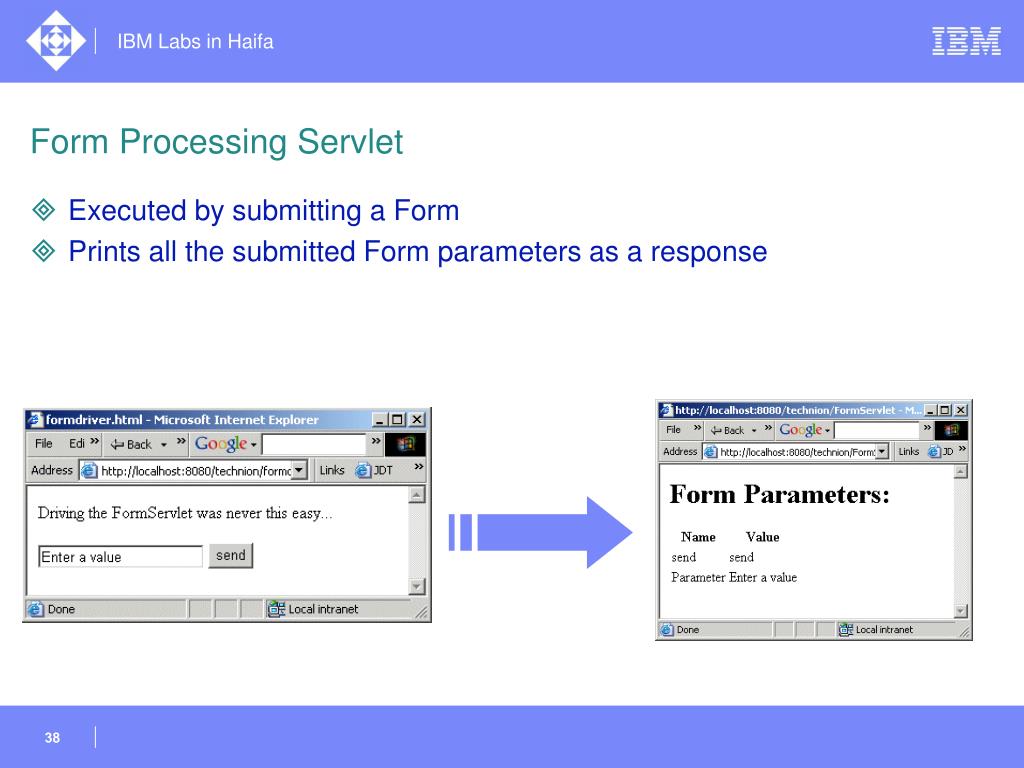 Form Processing Servlet • Executed by submitting a Form • Prints all the submitted Form parameters as a response