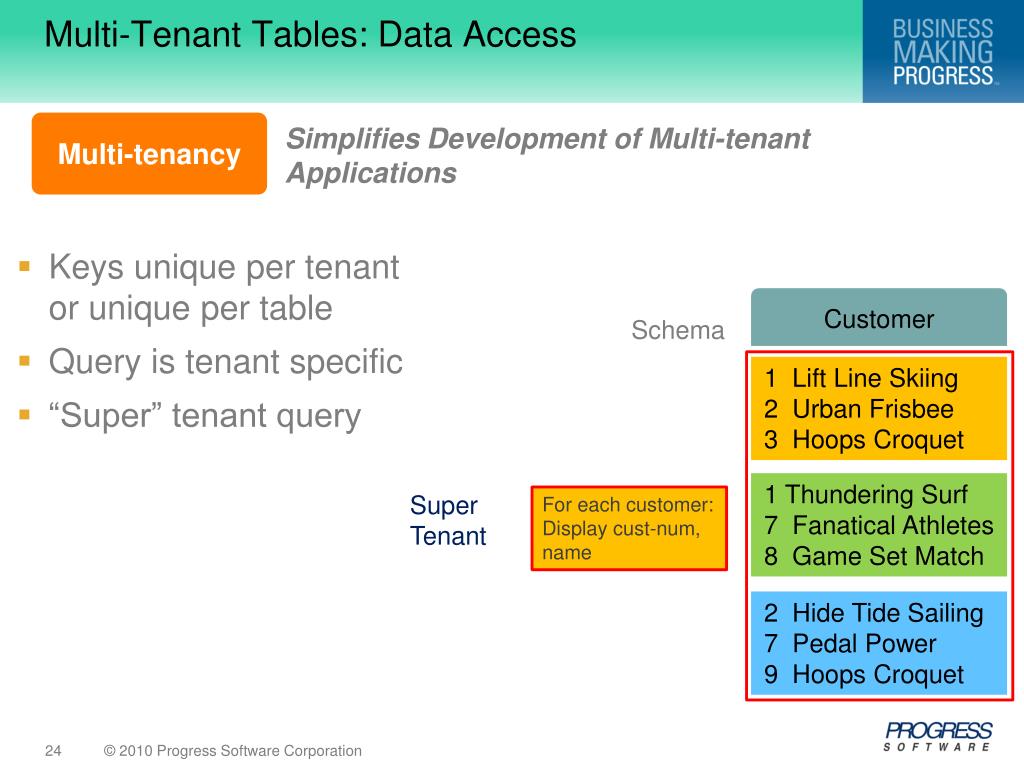 Keys unique per tenant or unique per table Query is tenant specific Multi-Tenant Tables: Data Access Simplifies Development of Multi-tenant Applications Multi-tenancy Customer Schema 1 Lift Line Skiing 2 Urban Frisbee 3 Hoops Croquet 1 Lift Line Skiing 2 Urban Frisbee 3 Hoops Croquet Tenant 1 partition FIND CUSTOMER WHERE CUST_NUM=2. Tenant 1 Partition 1 Thundering Surf 7 Fanatical Athletes 8 Game Set Match Tenant 2 partition 2 Hide Tide Sailing 7 Pedal Power 9 Hoops Croquet Tenant 3 partition