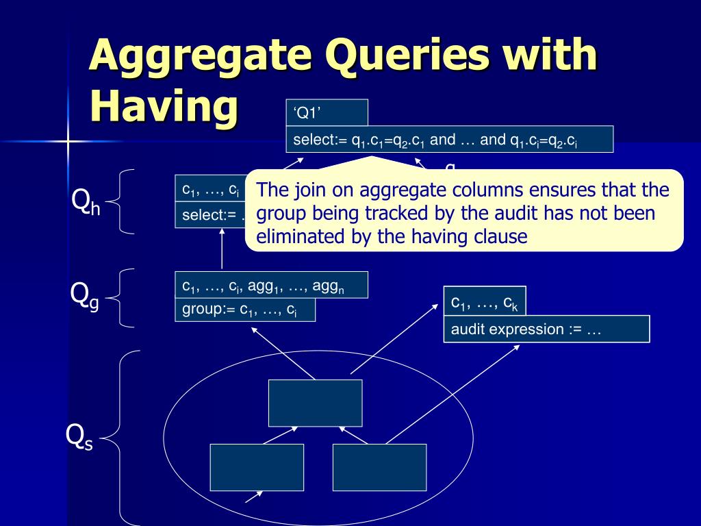 ‘Q1’ select:= q1.c1=q2.c1 and … and q1.ci=q2.ci q1 q1 c1, …, ck c1, …, ck audit expression := … audit expression := … Aggregate Queries with Having The join on aggregate columns ensures that the group being tracked by the audit has not been eliminated by the having clause c1, …, ci Qh select:= … Qg c1, …, ci, agg1, …, aggn group:= c1, …, ci Qs