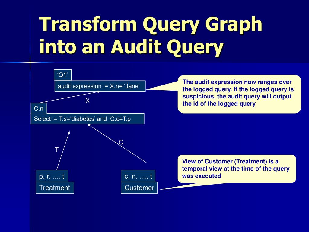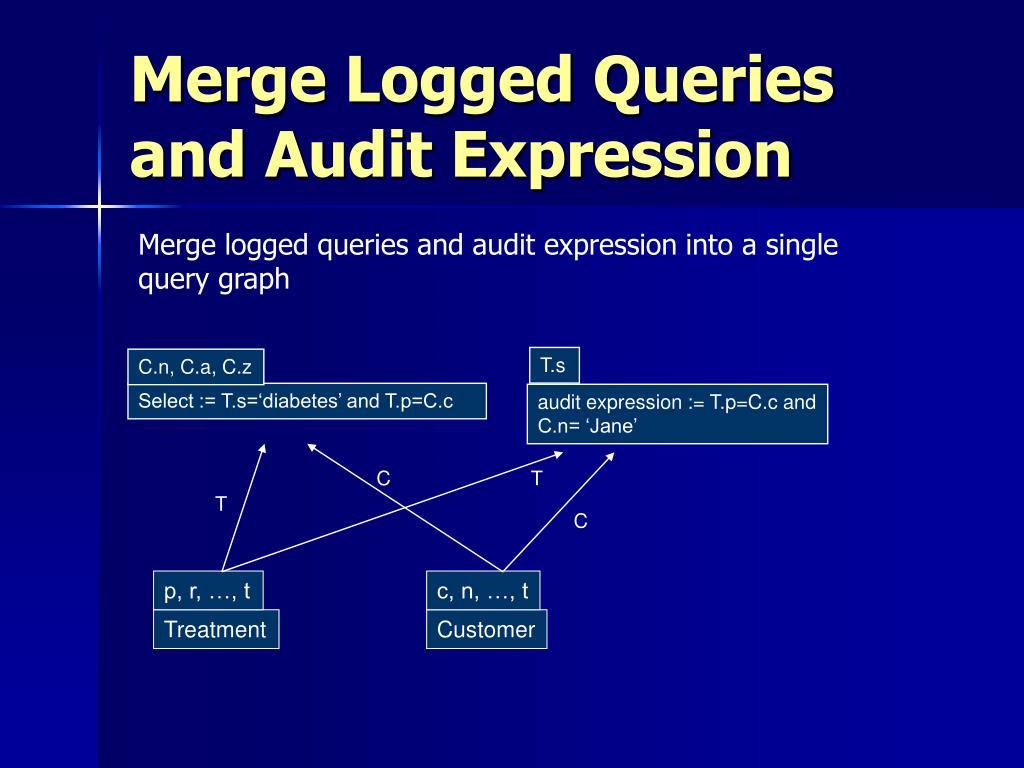 Merge Logged Queries and Audit Expression Merge logged queries and audit expression into a single query graph T.s C.n, C.a, C.z Select := T.s=‘diabetes’ and T.p=C.c audit expression := T.p=C.c and C.n= ‘Jane’ C T T C p, r, …, t c, n, …, t Treatment Customer