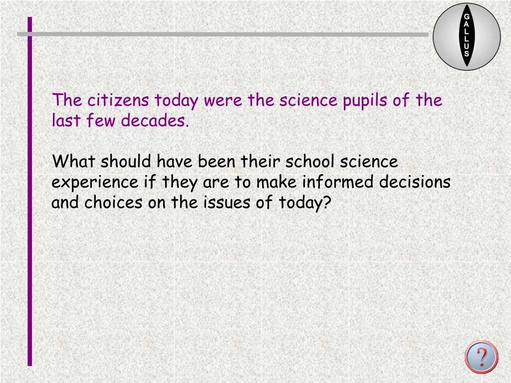 The citizens today were the science pupils of the last few decades. What should have been their school science experience if they are to make informed decisions and choices on the issues of today?