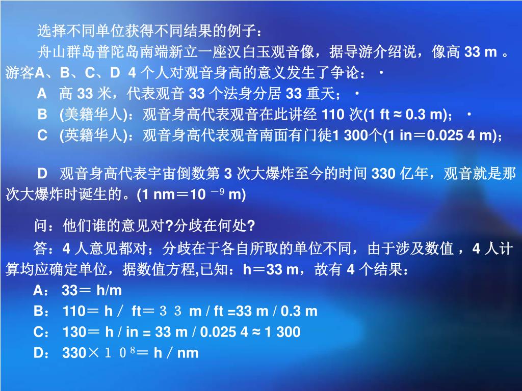 选择不同单位获得不同结果的例子: 舟山群岛普陀岛南端新立一座汉白玉观音像,据导游介绍说,像高 33 m 。 游客A、B、C、D 4 个人对观音身高的意义发生了争论: A 高 33 米,代表观音 33 个法身分居 33 重天; B (美籍华人):观音身高代表观音在此讲经 110 次(1 ft ≈ 0.3 m); C (英籍华人):观音身高代表观音南面有门徒1 300个(1 in=0.025 4 m); D 观音身高代表宇宙倒数第 3 次大爆炸至今的时间 330 亿年,观音就是那 次大爆炸时诞生的。(1 nm=10 -9 m) 问:他们谁的意见对?分歧在何处? 答:4 人意见都对;分歧在于各自所取的单位不同,由于涉及数值 ,4 人计 算均应确定单位,据数值方程,已知:h=33 m,故有 4 个结果: A: 33= h/m B: 110= h/ ft=33 m / ft =33 m / 0.3 m C: 130= h / in = 33 m / 0.025 4 ≈ 1 300 D: 330×108= h/nm