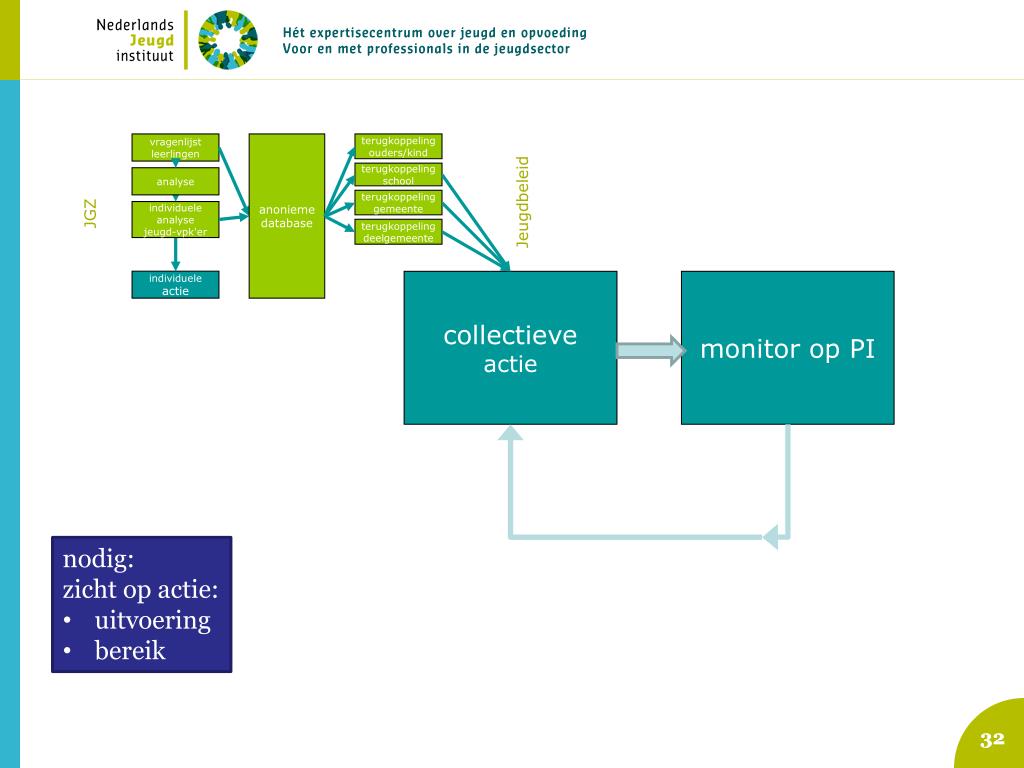 analyse individuele analyse jeugd-vpk'er individuele actie vragenlijst leerlingen anonieme database terugkoppeling ouders/kind terugkoppeling school Jeugdbeleid terugkoppeling gemeente JGZ terugkoppeling deelgemeente collectieve actie monitor op PI • nodig: • zicht op actie: • uitvoering • bereik 32