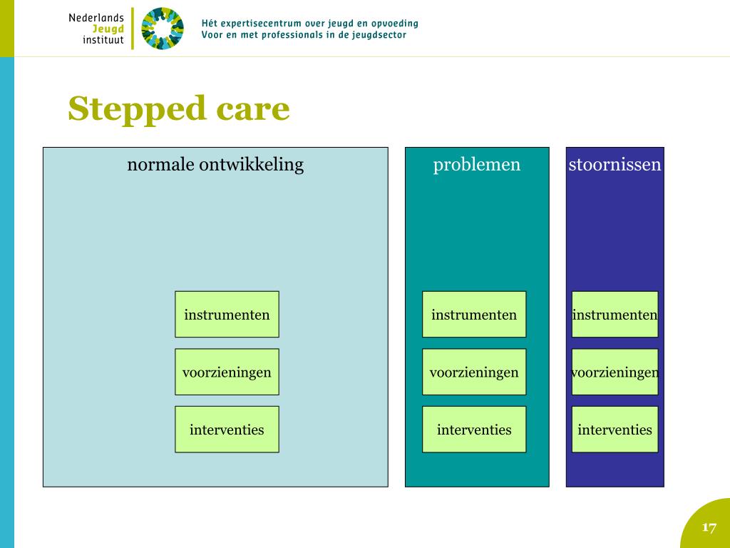 instrumenten instrumenten instrumenten voorzieningen voorzieningen voorzieningen interventies interventies interventies Stepped care normale ontwikkeling problemen stoornissen