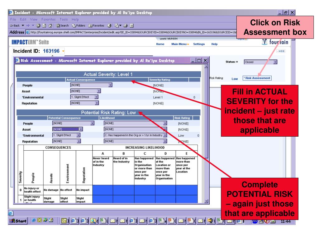 Click on Risk Assessment box Fill in ACTUAL SEVERITY for the incident – just rate those that are applicable Complete POTENTIAL RISK – again just those that are applicable