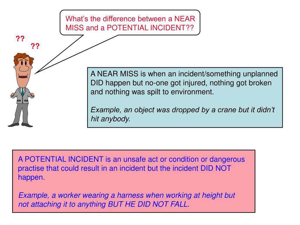What’s the difference between a NEAR MISS and a POTENTIAL INCIDENT?? ?? ?? A NEAR MISS is when an incident/something unplanned DID happen but no-one got injured, nothing got broken and nothing was spilt to environment. Example, an object was dropped by a crane but it didn’t hit anybody. A POTENTIAL INCIDENT is an unsafe act or condition or dangerous practise that could result in an incident but the incident DID NOT happen. Example, a worker wearing a harness when working at height but not attaching it to anything BUT HE DID NOT FALL.