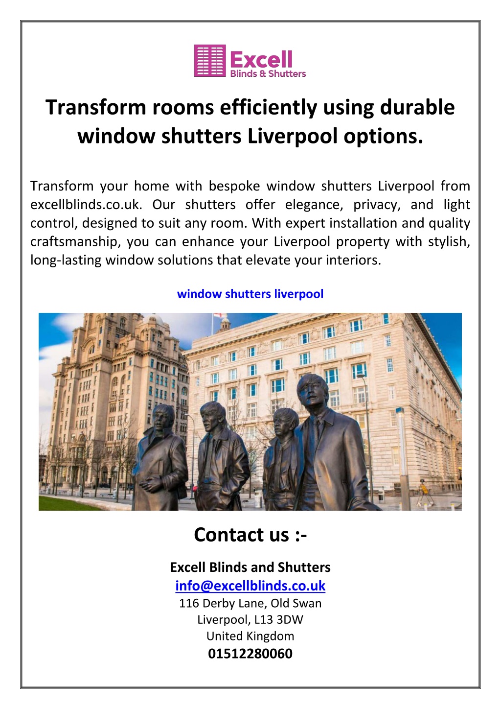 Transform rooms efficiently using durable window shutters Liverpool options. Transform your home with bespoke window shutters Liverpool from excellblinds.co.uk. Our shutters offer elegance, privacy, and light control, designed to suit any room. With expert installation and quality craftsmanship, you can enhance your Liverpool property with stylish, long-lasting window solutions that elevate your interiors. window shutters liverpool Contact us :- Excell Blinds and Shutters info@excellblinds.co.uk 116 Derby Lane, Old Swan Liverpool, L13 3DW United Kingdom 01512280060
