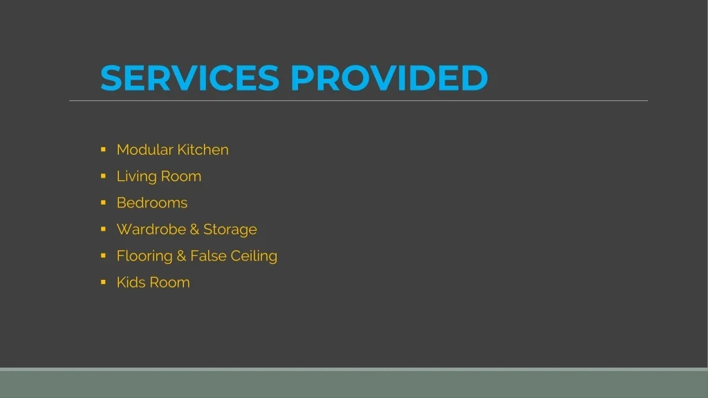 SERVICES PROVIDED • Modular Kitchen • Living Room • Bedrooms • Wardrobe & Storage • Flooring & False Ceiling • Kids Room