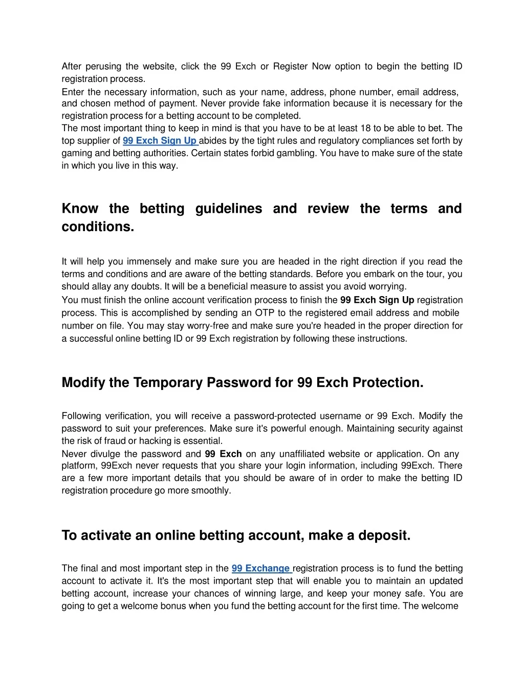 After perusing the website, click the 99 Exch or Register Now option to begin the betting ID registrationprocess. Enterthenecessaryinformation,suchasyourname,address,phonenumber,emailaddress, and chosen method of payment. Never provide fake information because it is necessary for the registrationprocessforabettingaccounttobecompleted. The most important thing to keep in mind is that you have to be at least 18 to be able to bet. The topsupplierof99ExchSignUpabidesbythetight rulesandregulatorycompliancessetforth by gamingandbettingauthorities.Certainstatesforbidgambling.Youhavetomakesureofthestate inwhichyouliveinthisway. Knowthebettingguidelinesandreviewthetermsand conditions. It will help you immensely and make sure you are headed in the right direction if you read the terms and conditions and are aware of the betting standards. Before you embark on the tour, you shouldallayanydoubts. Itwill beabeneficialmeasureto assistyou avoidworrying. You must finish the online account verification process to finish the 99 Exch Sign Up registration process.ThisisaccomplishedbysendinganOTPtotheregisteredemailaddressandmobile number on file. You may stay worry-free and make sure you're headed in the proper direction for asuccessfulonline betting IDor 99Exchregistrationbyfollowingtheseinstructions. ModifytheTemporaryPassword for99ExchProtection. Following verification, you will receive a password-protected username or 99 Exch. Modify the password to suit your preferences. Make sure it's powerful enough. Maintaining security against theriskoffraudor hackingisessential. Neverdivulgethepasswordand99Exchonanyunaffiliatedwebsiteorapplication.Onany platform, 99Exch never requests that you share your login information, including 99Exch. There are a few more important details that you should be aware of in order to make the betting ID registrationproceduregomoresmoothly. Toactivate anonline bettingaccount,makeadeposit. The final and most important step in the 99 Exchangeregistration process is to fund the betting account to activate it. It's the most important step that will enable you to maintain an updated betting account, increase your chances of winning large, and keep your money safe. You are goingtogetawelcomebonuswhenyoufundthe betting accountforthe firsttime.Thewelcome