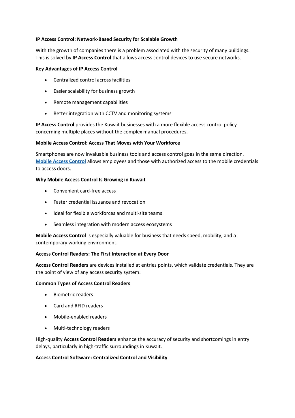 IP Access Control: Network-Based Security for Scalable Growth With the growth of companies there is a problem associated with the security of many buildings. This is solved by IP Access Control that allows access control devices to use secure networks. Key Advantages of IP Access Control • Centralized control across facilities • Easier scalability for business growth • Remote management capabilities • Better integration with CCTV and monitoring systems IP Access Control provides the Kuwait businesses with a more flexible access control policy concerning multiple places without the complex manual procedures. Mobile Access Control: Access That Moves with Your Workforce Smartphones are now invaluable business tools and access control goes in the same direction. Mobile Access Control allows employees and those with authorized access to the mobile credentials to access doors. Why Mobile Access Control Is Growing in Kuwait • Convenient card-free access • Faster credential issuance and revocation • Ideal for flexible workforces and multi-site teams • Seamless integration with modern access ecosystems Mobile Access Control is especially valuable for business that needs speed, mobility, and a contemporary working environment. Access Control Readers: The First Interaction at Every Door Access Control Readers are devices installed at entries points, which validate credentials. They are the point of view of any access security system. Common Types of Access Control Readers • Biometric readers • Card and RFID readers • Mobile-enabled readers • Multi-technology readers High-quality Access Control Readers enhance the accuracy of security and shortcomings in entry delays, particularly in high-traffic surroundings in Kuwait. Access Control Software: Centralized Control and Visibility